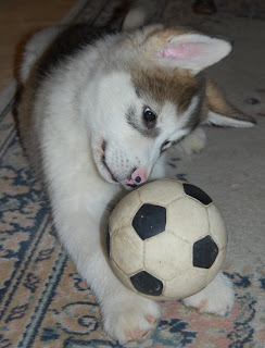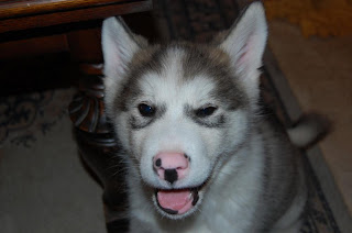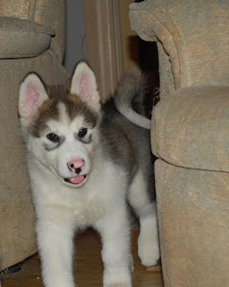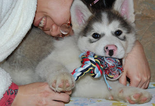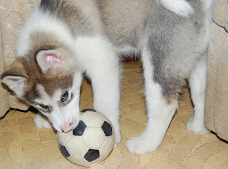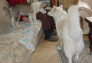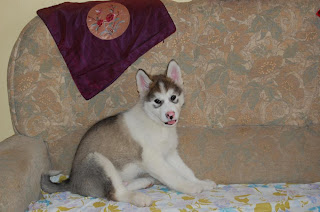 開始愛玩,知道自己處在一個安全的環境所以也不大黏牠媽了,叫半天只來親一下敷衍敷衍。很會撒嬌賴皮,明明已經快十公斤,腿也夠長可以自己跳上床和沙發,還是兩隻前腳搭在那兒對著牠媽我嗚嗚叫,要人捧著牠的屁股蹬上來。小把戲小精明學得很快。婆婆的兩隻狗怎麼玩玩什麼,牠也很快可以依樣畫葫蘆。