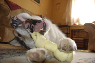 Sometimes, it even gets more funny - Nuage plays with the piggy like a puppet and then Denver starts to jump everywhere, bark, howl and run trough the apartment with full speed :-)